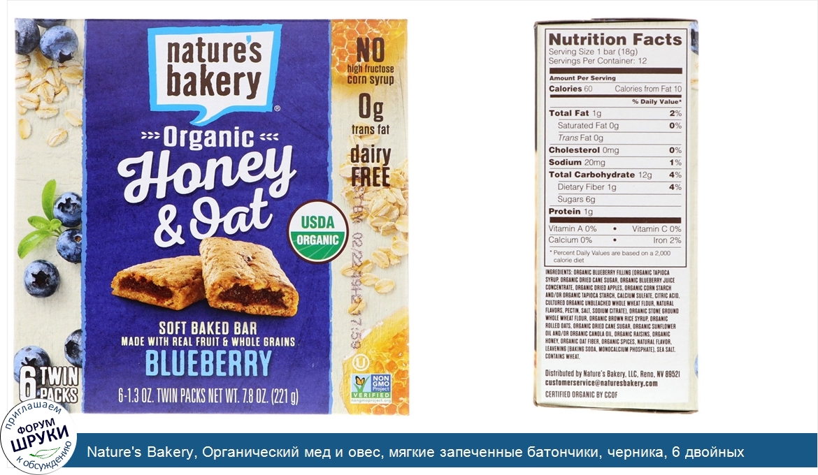 ru Nature's Bakery, Органический мед и овес, мягкие запеченные батончики, черника, 6 двойных упаковок, по 1,3 унции каждый