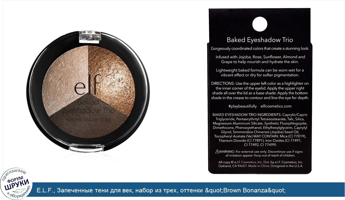Друзья, если у вас есть отзыв/дополнение/комментарий/вопрос относительно E.L.F., Запеченные тени для век, набор из трех, оттенки &quot;Brown Bonanza&quot; (&quot;коричневое золото&quot;), 0,14 унции (3,9 г) - напишите его ответом в эту тему (это будет полезно всему сообществу в целом и вам в отдельности).
