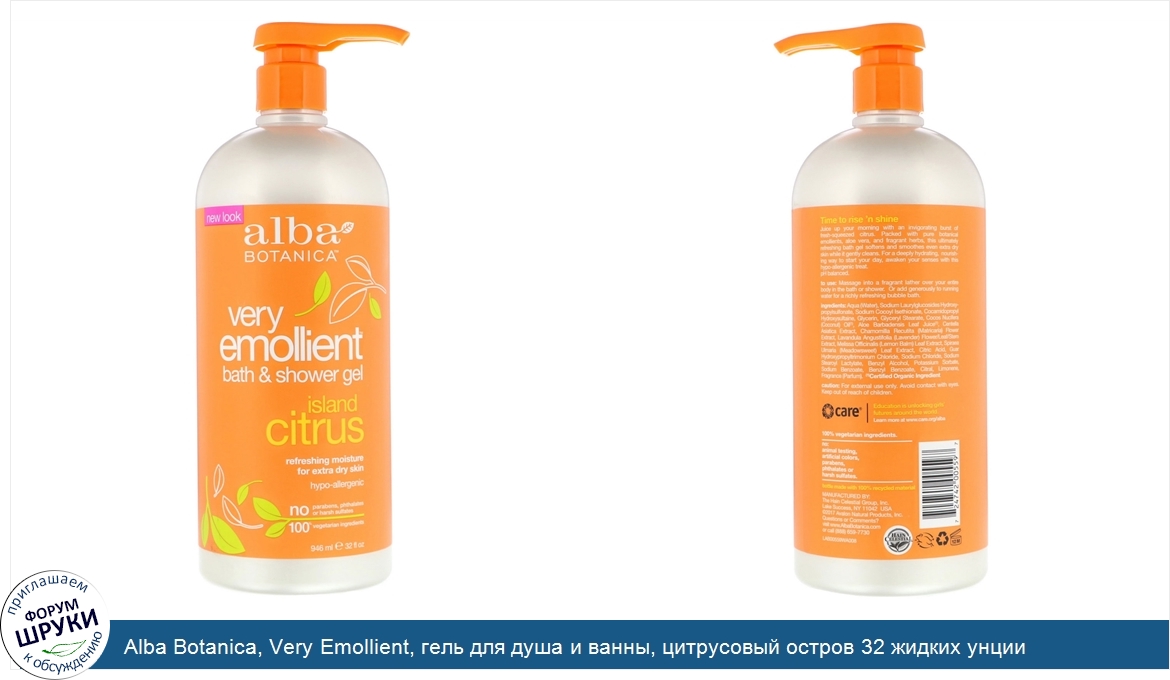 Друзья, если у вас есть отзыв/дополнение/комментарий/вопрос относительно Alba Botanica, Very Emollient, гель для душа и ванны, цитрусовый остров 32 жидких унции (946 мл) - напишите его ответом в эту тему (это будет полезно всему сообществу в целом и вам в отдельности).