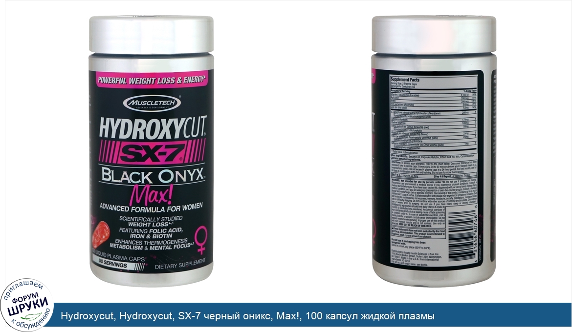 [DESCRIPT]Powerful Weight Loss Energy. Research Development. Advanced Formula For Women. Scientifically Studied Weight Loss. 1. Featuring Folic Acid, Iron Biotin. Enhances Thermogenesis, Metabolism Mental Focus. 2. 50 Servings. Dietary Supplement. Advanced Formula For Women. A woman knows her body best! That's why Hydroxycut SX-7 Black Onyx Max! was made by women, for women! Its advanced formula was inspired by our - the active woman who deserves the best. Each serving delivers the female-friendly nutrients you want, like folic acid and iron, plus it provides biotin and choline. For real weight loss you can trust, Hydroxycut SX-7 Black Onyx Max! also features a scientifically tested weight loss driver! Powerful Weight Loss You Can Trust. 1. In 2 separate studies, subjects using C. canephora robusta, as found in Hydroxycut SX-7 Black Onyx Max!, lost 10.95 lbs. in 60 days following a low-calorie diet, and 3.7 lbs. in 8 weeks following a calorie-reduced diet and performance moderate exercise. 2. Whether you're in the gym, at work or just trying to tackle life's daily goals, you're always on the go. That's why Hydroxycut SX-7 Black Onyx Max! also provides caffeine anhydrous to ignite energy enhance focus, boost your metabolism and enhance thermogenesis.[/DESCRIPT]... (описание дополняется)