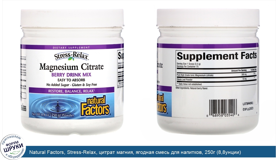 Друзья, если у вас есть отзыв/дополнение/комментарий/вопрос относительно Natural Factors, Stress-Relax, цитрат магния, ягодная смесь для напитков, 250г (8,8унции) - напишите его ответом в эту тему (это будет полезно всему сообществу в целом и вам в отдельности).