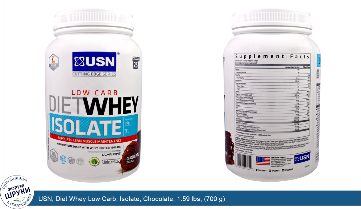 [DESCRIPT]Only 1 g Sugar Per Serving. Cutting Edge Series. 25 Servings. Dietary Supplement. 20 g Protein - 1 Sugar Per Serving. Supports Lean Muscle Maintenance. High Protein Shake with Whey Protein Isolate. Advanced Formulation with L-Carnitine. 31 Daily. For Men Women. Phytofare. Tolerase L. Natural and Artificial Flavor. 25 Servings - 1 Scoop Per Serving- Anytime for Women Men. Benefits. Protein contributes to the maintenance of lean muscle. Vitamin D contributes to maintenance of normal bones and muscle function. Vitamin C maintains the normal function of the immune system, and contributes to the reduction of tiredness and fatigue. Calcium supports normal energy-yielding metabolism and normal function of digestive enzymes. It also needed for the maintenance of normal bones teeth. Vitamin B6 supports normal protein glycogen metabolism, normal function of the immune system, and regulation of hormonal activity. Vitamin B12 contributes to the reduction of tiredness and fatigue: it also contributes to normal function of the immune system. Magnesium contributes to a reduction of tiredness and fatigue. It is also needed for normal energy yielding metabolism, as well as normal functioning of the nervous system and muscles.-. Zinc contributes to protection of cells from oxidative stress. Contains Tolerase L (pH-stable lactase). Lactase enzyme improves lactose digestion in individuals who have difficulty digesting lactose. Product Information. USN's Diet Whey Isolate represents the newest and most advanced technology in supplementing a weight management and lean muscle maintenance plan. This delicious shake provides you with a low calorie snack, high in protein with only 4 g of carbohydrate per serving. USN Diet Whey Isolate is easy to prepare and contains a combination of Garcinia Cambogia, Green Tea (leaf) Catechin Complex (Phytofare), L-Carnitine, Vitamin D, Vitamin C, Calcium, Magnesium and Zinc to help support weight control, muscle health, performance and maintenance.[/DESCRIPT]... (описание дополняется)