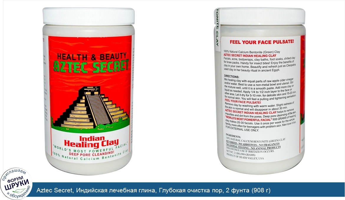 [DESCRIPT]Красота и здоровье. Глубокое очищение пор. 100 % натуральный кальций из бентонитовой глины. Почувствуйте как пульсирует ваше лицо! Уход за лицом, устранение угрей, обертывания тела, ванны с глиной, ванночки для ног, охлажденная глина для ухода за коленями. Незаменима при укусах насекомых. Наслаждайтесь полезными свойствами глины у себя дома. Украшает и освежает, так же как глина, которую использовала Клеопатра в древнем Египте для сохранения своей красоты. Секрет ацтеков — индийская лечебная глина удаляет загрязнения и грязь из пор. Глубокая очистка пор. «Самое эффективное в мире средство для лица» 908 грамм целебной глины хватает на 20-30 процедур по уходу за лицом. Используйте 1 раз в неделю всей семьей, особенно рекомендуется для подростков с проблемной кожей. Она нравится и мужчинам.[/DESCRIPT]... (описание дополняется)