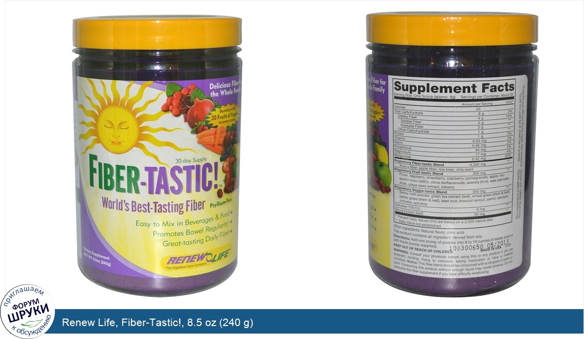 Друзья, если у вас есть отзыв/дополнение/комментарий/вопрос относительно Renew Life, Fiber-Tastic!, 8.5 oz (240 g) - напишите его ответом в эту тему (это будет полезно всему сообществу в целом и вам в отдельности).