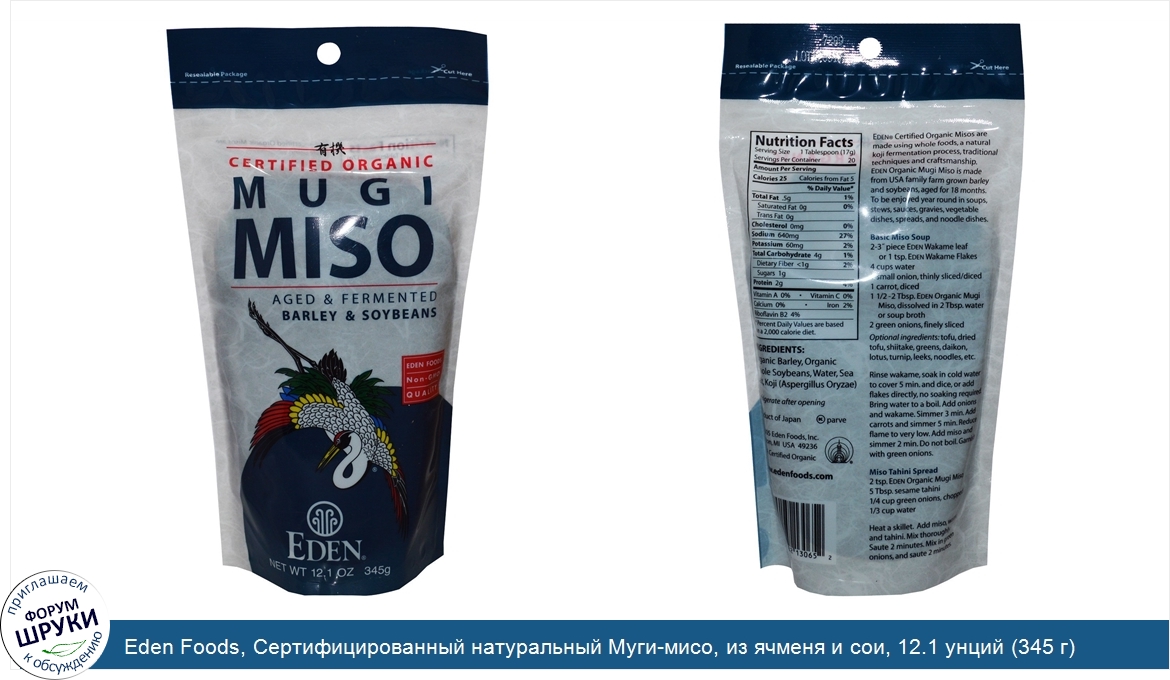Друзья, если у вас есть отзыв/дополнение/комментарий/вопрос относительно Eden Foods, Сертифицированный натуральный Муги-мисо, из ячменя и сои, 12.1 унций (345 г) - напишите его ответом в эту тему (это будет полезно всему сообществу в целом и вам в отдельности).