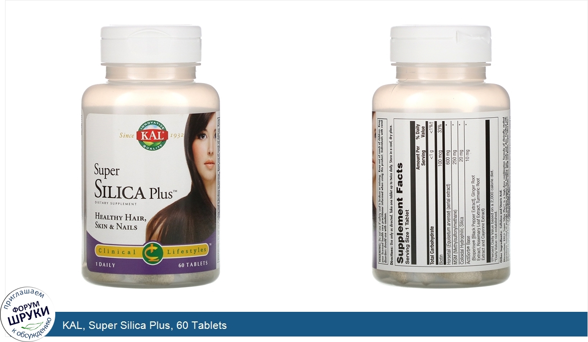 Since 1932. Innovative Quality. Dietary Supplement. 1 Daily. Healthy Hair, Skin Nails. Discussion: KAL Super Silica Plus is a high-dose combination formula of clinically studied ingredients intended to provide nu...
