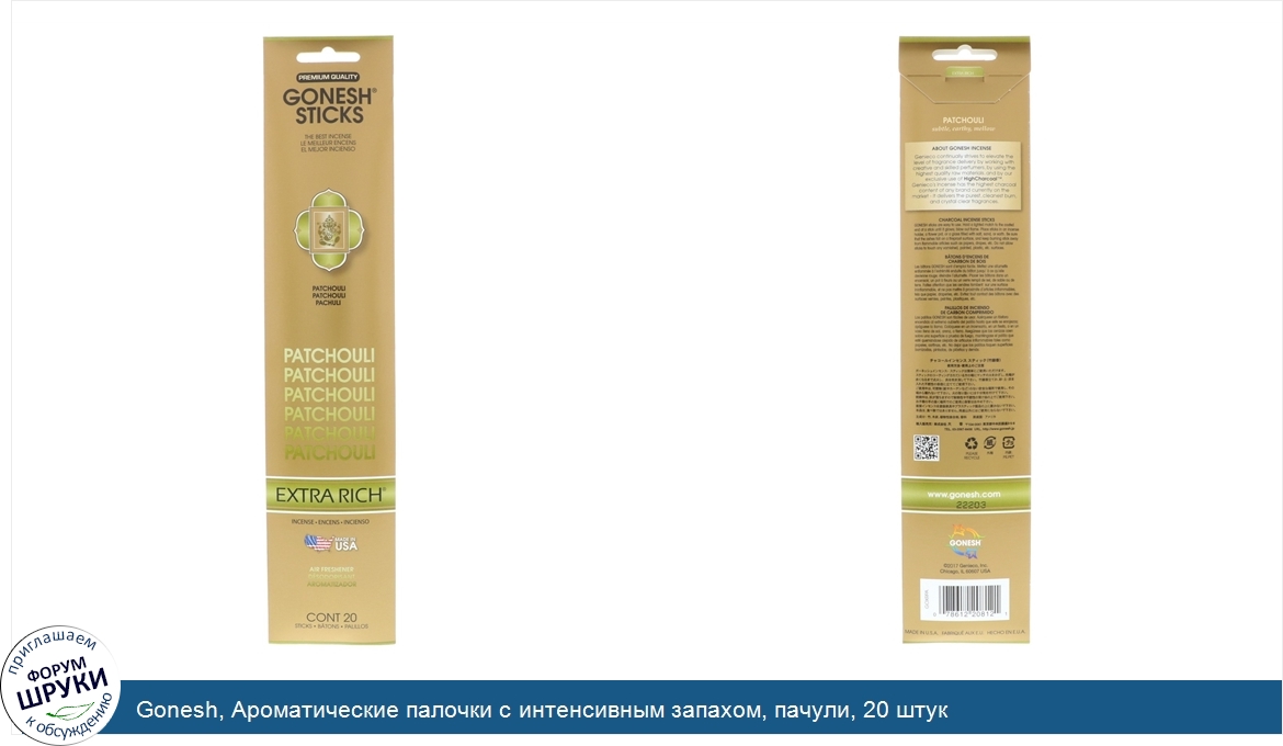 Gonesh, Ароматические палочки с интенсивным запахом, пачули, 20 штук