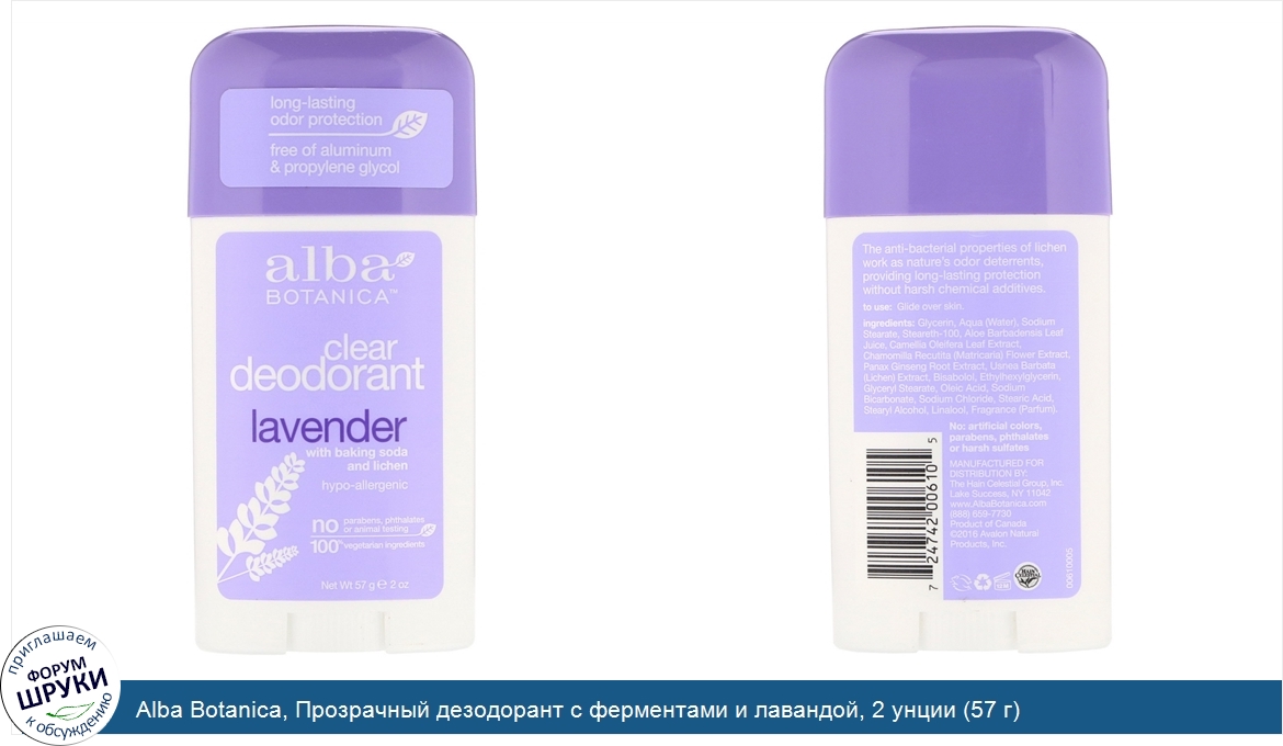 Друзья, если у вас есть отзыв/дополнение/комментарий/вопрос относительно Alba Botanica, Прозрачный дезодорант с ферментами и лавандой, 2 унции (57 г) - напишите его ответом в эту тему (это будет полезно всему сообществу в целом и вам в отдельности).