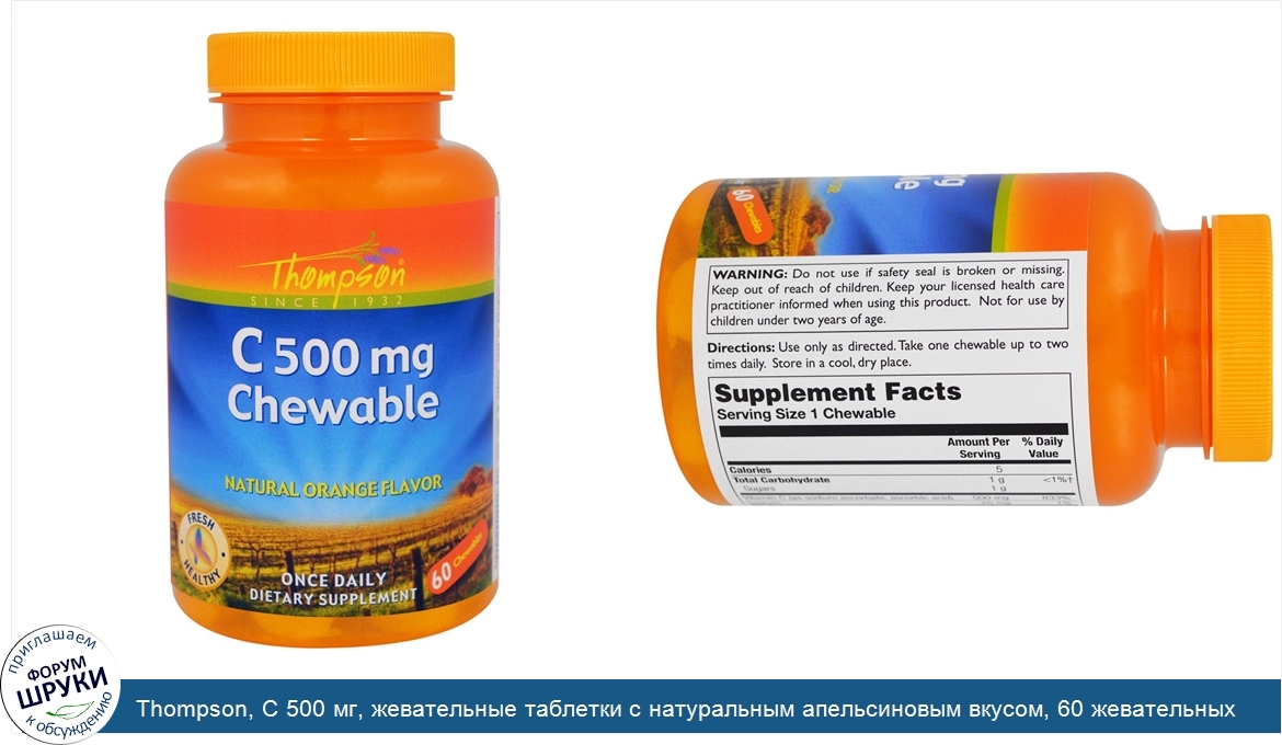 Друзья, если у вас есть отзыв/дополнение/комментарий/вопрос относительно Thompson, C 500 мг, жевательные таблетки с натуральным апельсиновым вкусом, 60 жевательных таблеток - напишите его ответом в эту тему (это будет полезно всему сообществу в целом и вам в отдельности).