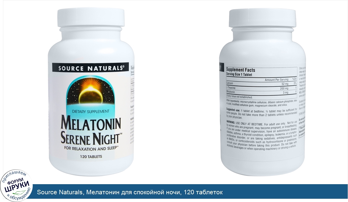 [DESCRIPT]Dietary Supplement. For Relaxation and Sleep. Stress can impact one's ability to fall asleep and can disturb the natural sleep-wake cycle. Source Naturals Melatonin Serine Night addresses these two aspects of occasional sleeplessness. Melatonin is a neurohormone shown in research to promote a normal and healthy sleep-wake cycle and to help the body ease into sleep more quickly. L-Theanine is an amino acid that may help to reduce tension and promote relaxation, which then may help the body transition to sleep more easily. Melatonin Serene Night delivers amounts of melatonin and theanine used in clinical trials.[/DESCRIPT]... (описание дополняется)