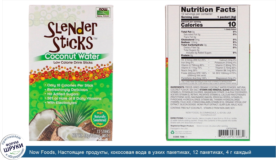 Друзья, если у вас есть отзыв/дополнение/комментарий/вопрос относительно Now Foods, Настоящие продукты, кокосовая вода в узких пакетиках, 12 пакетиках, 4 г каждый - напишите его ответом в эту тему (это будет полезно всему сообществу в целом и вам в отдельности).