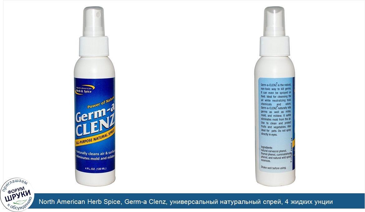 Друзья, если у вас есть отзыв/дополнение/комментарий/вопрос относительно North American Herb Spice, Germ-a Clenz, универсальный натуральный спрей, 4 жидких унции (120 мл) - напишите его ответом в эту тему (это будет полезно всему сообществу в целом и вам в отдельности).