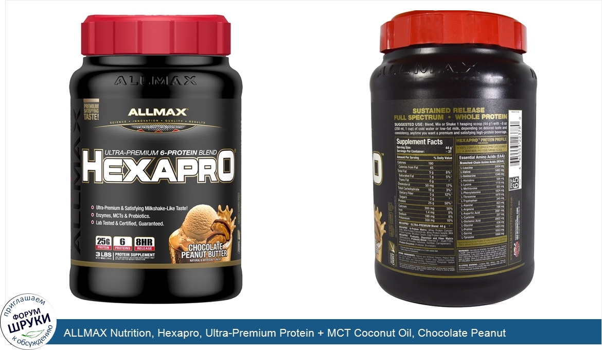 Друзья, если у вас есть отзыв/дополнение/комментарий/вопрос относительно ALLMAX Nutrition, Hexapro, Ultra-Premium Protein + MCT Coconut Oil, Chocolate Peanut Butter, 3 lbs (1.36 kg) - напишите его ответом в эту тему (это будет полезно всему сообществу в целом и вам в отдельности).