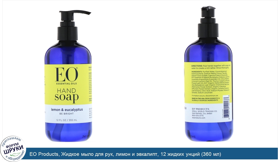 Друзья, если у вас есть отзыв/дополнение/комментарий/вопрос относительно EO Products, Жидкое мыло для рук, лимон и эвкалипт, 12 жидких унций (360 мл) - напишите его ответом в эту тему (это будет полезно всему сообществу в целом и вам в отдельности).