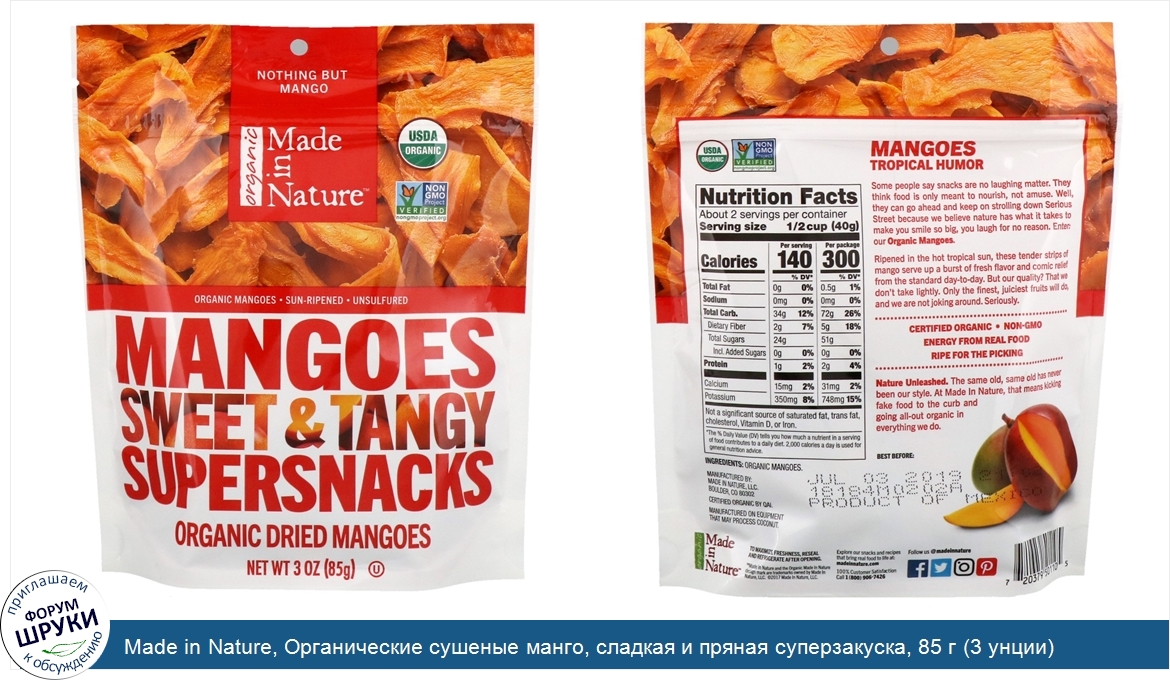 Друзья, если у вас есть отзыв/дополнение/комментарий/вопрос относительно Made in Nature, Органические сушеные манго, сладкая и пряная суперзакуска, 85 г (3 унции) - напишите его ответом в эту тему (это будет полезно всему сообществу в целом и вам в отдельности).