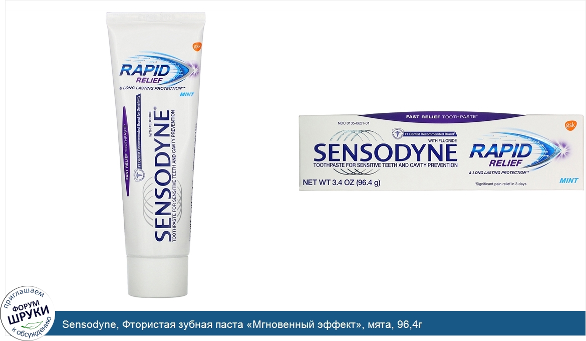 [DESCRIPT]Fast Relief Toothpaste*. 9 Out of 10 Dentists' Recommended Brand. #1 Dentist Recommended Brand for Sensitive Teeth. Toothpaste for Sensitive Teeth and Cavity Prevention. Long Lasting Protection**. Fast Relief* and Long Lasting Protection**. Why use Sensodyne Rapid Relief? Sensodyne Rapid Relief is clinically proven for fast relief of sensitivity pain. Its formula quickly creates a barrier over sensitive areas of your teeth to provide fast relief, and to help stop the pain from coming back. With twice daily brushing, it builds ongoing protection from the pain of sensitive teeth. It also helps whiten and prevents staining. Exposed Dentin; Cause of Sensitivity Pain. Tiny Holes in Dentin. Fast Acting Formula. Quickly Creates a Barrier. Fast Relief from Pain*. Uses. :. Aids in the prevention of dental cavities. Builds increasing protection against painful sensitivity of the teeth to cold, heat, acids, sweets, or contact. Products containing stannous fluoride may produce surface staining of the teeth. Adequate toothbrushing may prevent these stains which are not harmful or permanent and may be removed by your dentist. This product is specially formulated to help prevent staining. *Significant pain relief in 3 days. **With twice daily brushing[/DESCRIPT]... (описание дополняется)