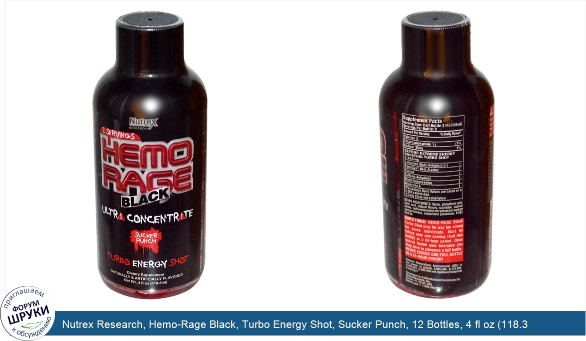 Nutrex Research, Hemo-Rage Black, Turbo Energy Shot, Sucker Punch, 12 Bottles, 4 fl oz (118.3 ml) Each