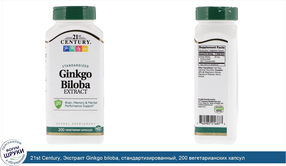 21st Century, Экстракт Ginkgo biloba, стандартизированный, 200 вегетарианских капсул