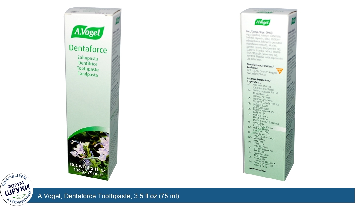 Друзья, если у вас есть отзыв/дополнение/комментарий/вопрос относительно A Vogel, Dentaforce Toothpaste, 3.5 fl oz (75 ml) - напишите его ответом в эту тему (это будет полезно всему сообществу в целом и вам в отдельности).