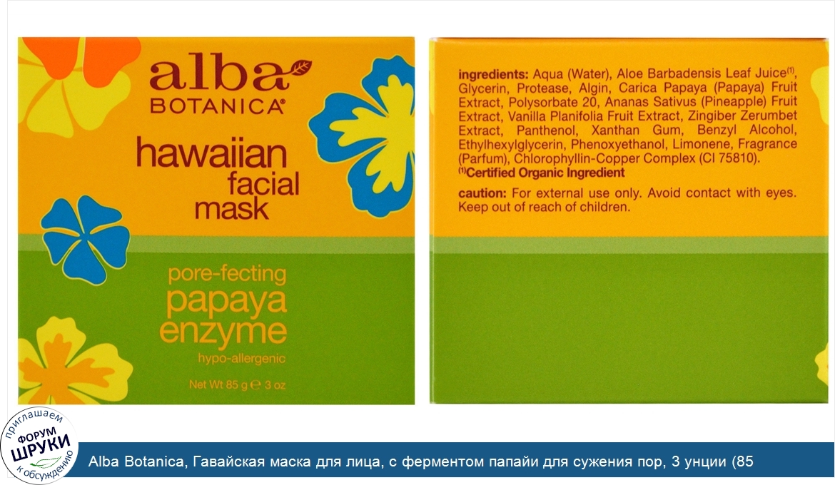 Друзья, если у вас есть отзыв/дополнение/комментарий/вопрос относительно Alba Botanica, Гавайская маска для лица, с ферментом папайи для сужения пор, 3 унции (85 г) - напишите его ответом в эту тему (это будет полезно всему сообществу в целом и вам в отдельности).