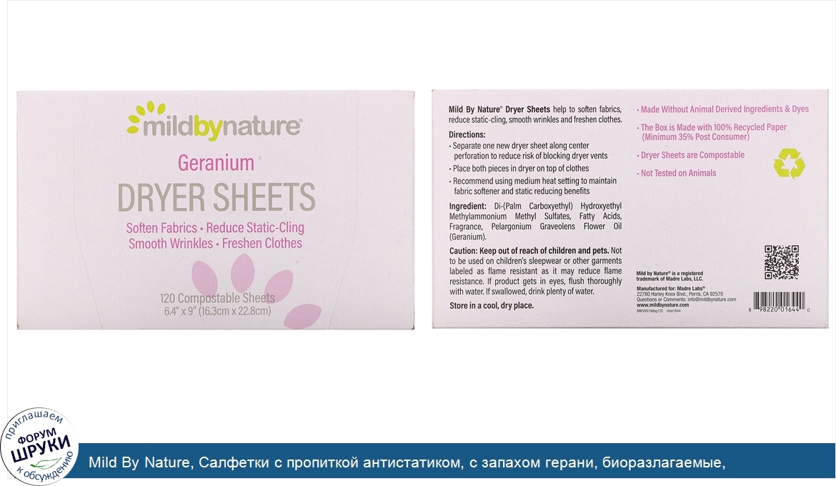 . Салфетки с пропиткой антистатиком. Mild By Nature. Аромат герани. Способствует смягчению ткани. Сводит к минимуму залипание белья из-за статической электризации. Разглаживает складки. Освежает белье. Биоразлага...