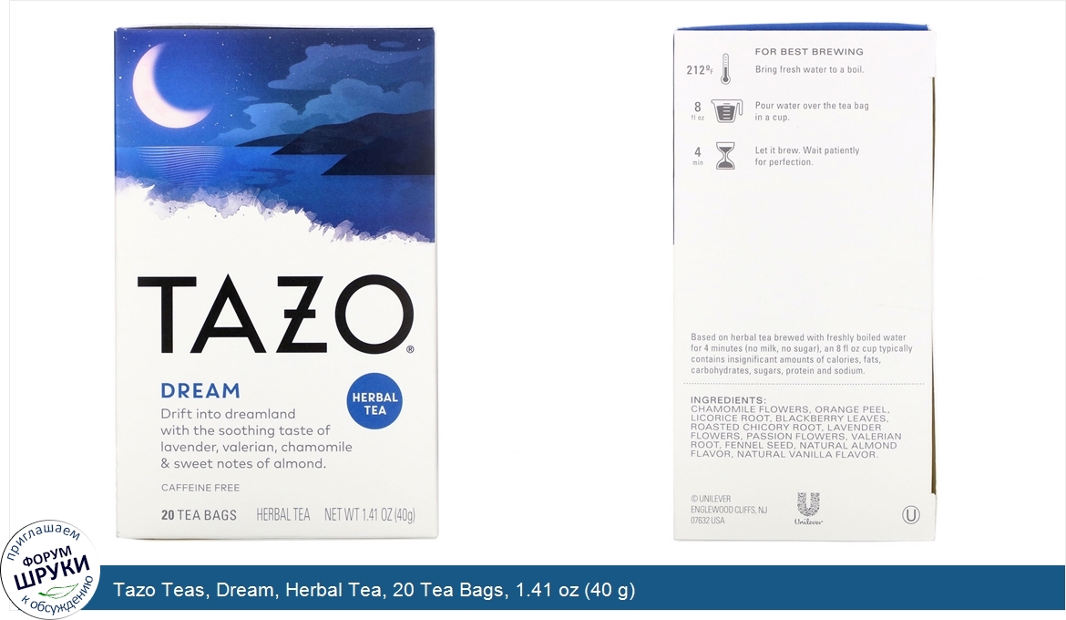 Друзья, если у вас есть отзыв/дополнение/комментарий/вопрос относительно Tazo Teas, Dream, Herbal Tea, 20 Tea Bags, 1.41 oz (40 g) - напишите его ответом в эту тему (это будет полезно всему сообществу в целом и вам в отдельности).
