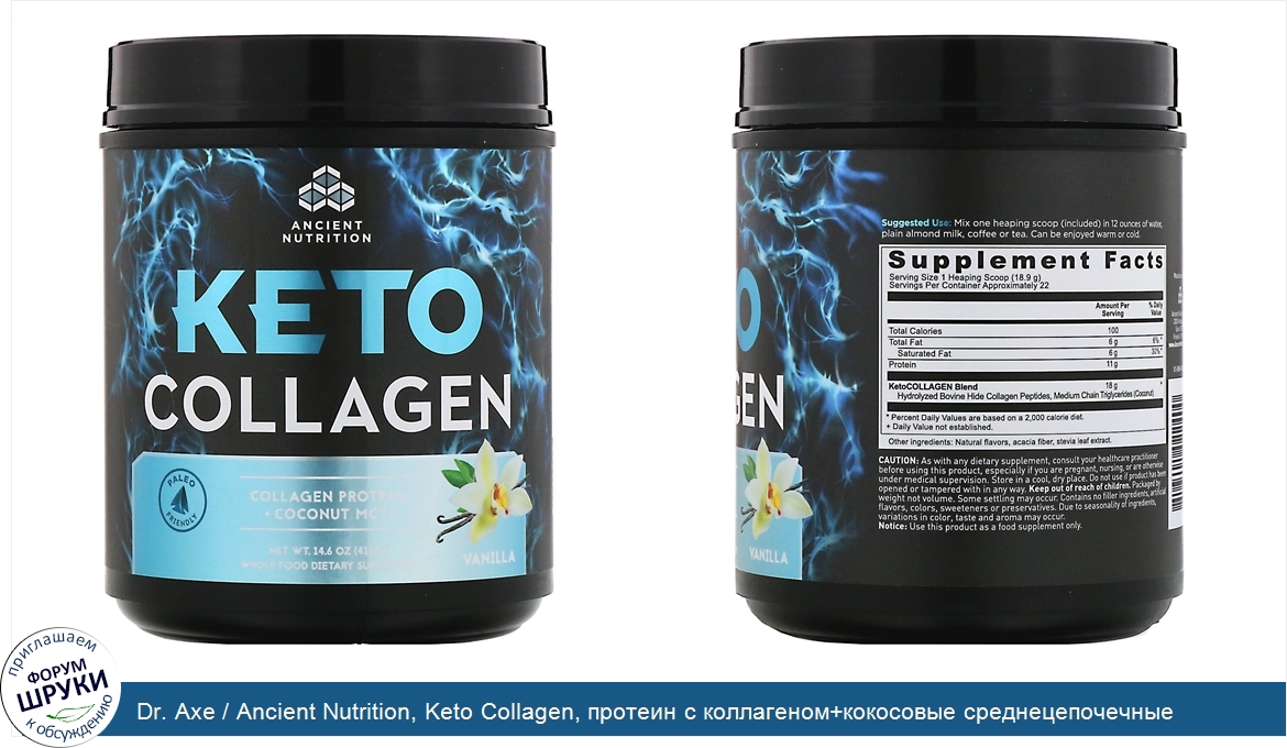 Dr. Axe / Ancient Nutrition, Keto Collagen, протеин с коллагеном+кокосовые среднецепочечные триглицериды, ваниль, 415г (14,6унции)