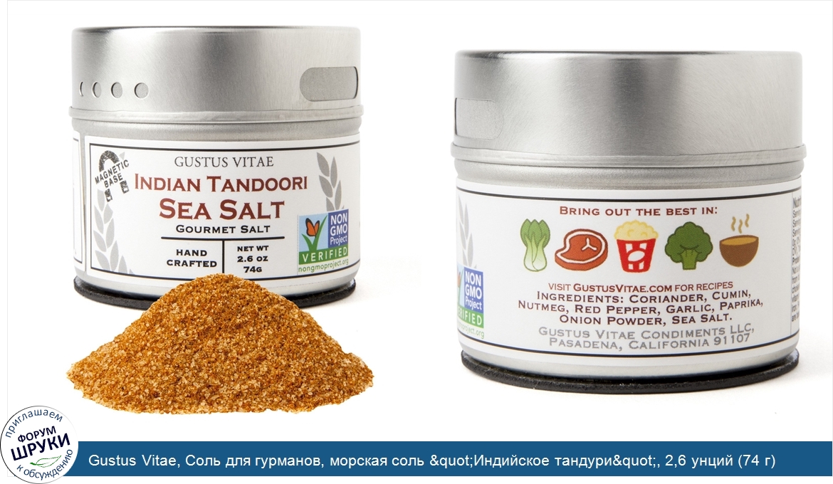 Друзья, если у вас есть отзыв/дополнение/комментарий/вопрос относительно Gustus Vitae, Соль для гурманов, морская соль "Индийское тандури", 2,6 унций (74 г) - напишите его ответом в эту тему (это будет полезно всему сообществу в целом и вам в отдельности).
