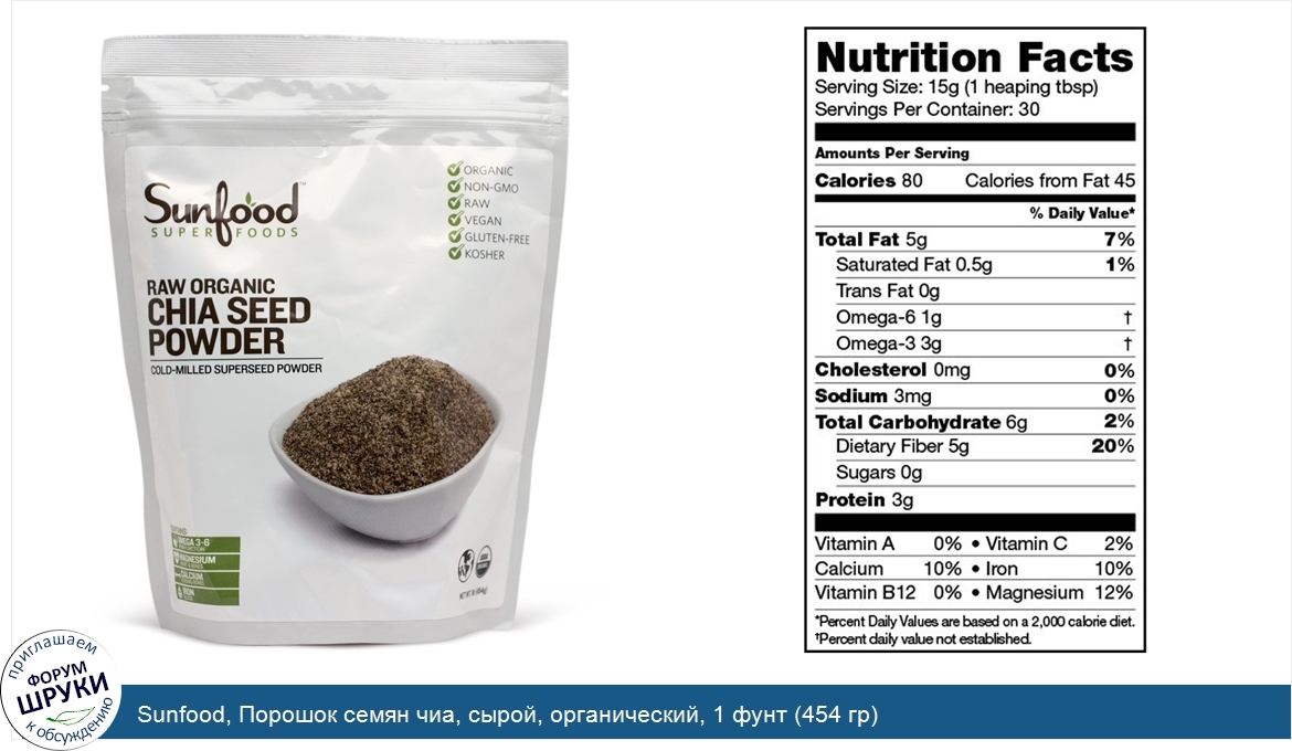 Друзья, если у вас есть отзыв/дополнение/комментарий/вопрос относительно Sunfood, Порошок семян чиа, сырой, органический, 1 фунт (454 гр) - напишите его ответом в эту тему (это будет полезно всему сообществу в целом и вам в отдельности).