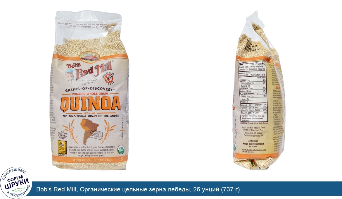 Для Вашего здоровья.Боб Мур. Не содержит глютен. Зерна открытий. Традиционный злак Андов. Семейная компания. Компания Bob's Red Mill — ключ к цельным злакам. 100 % цельные злаки. 46 г или более цельнозерновых в к...