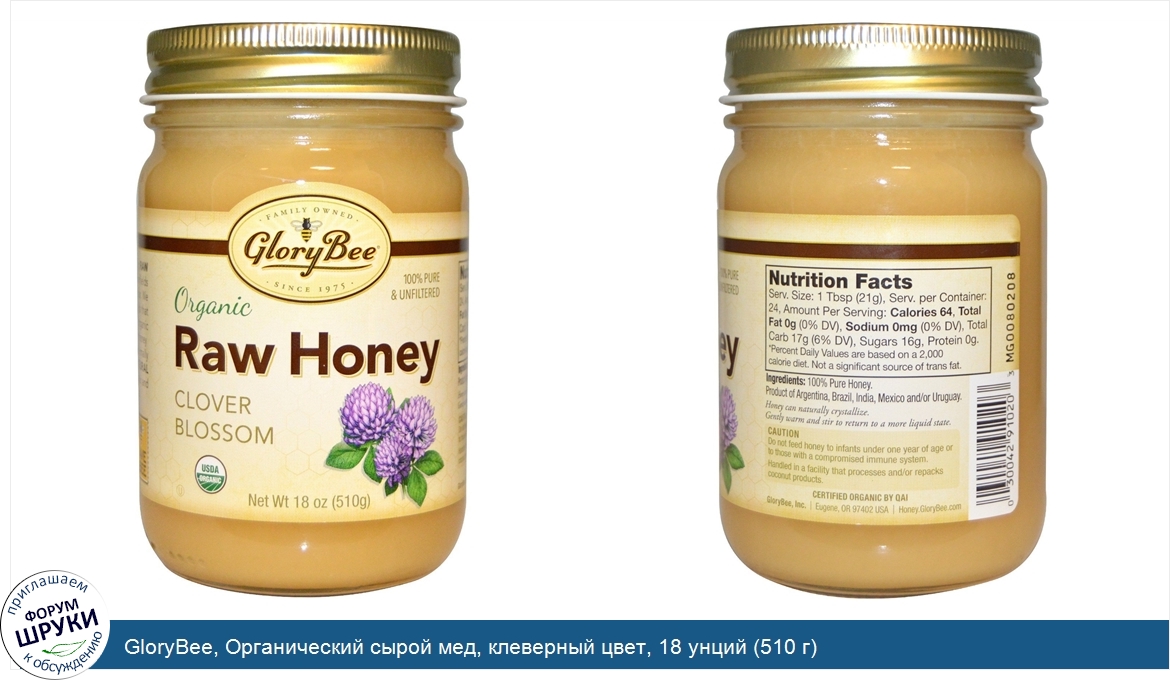 ru GloryBee, Органический сырой мед, клеверный цвет, 18 унций (510 г)