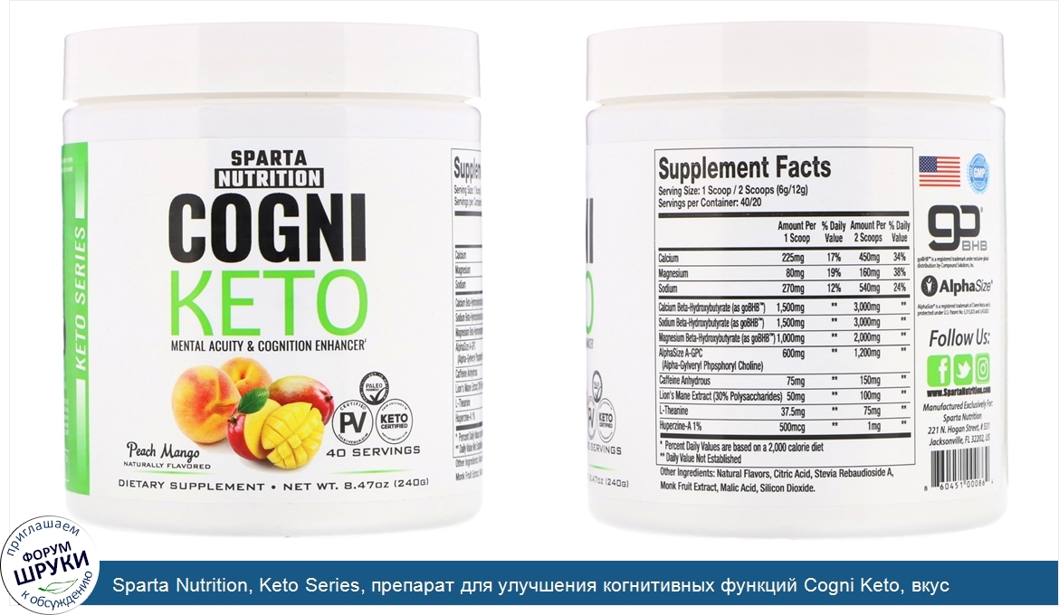 ru Sparta Nutrition, Keto Series, препарат для улучшения когнитивных функций Cogni Keto, вкус персик-манго, 8,47 унц. (240 г)