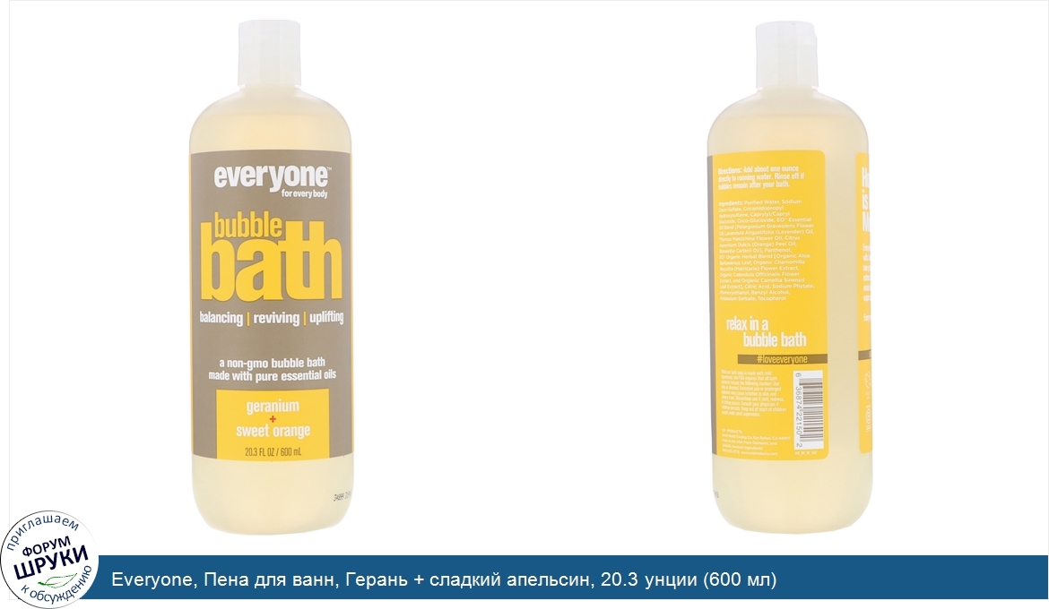 Друзья, если у вас есть отзыв/дополнение/комментарий/вопрос относительно Everyone, Пена для ванн, Герань + сладкий апельсин, 20.3 унции (600 мл) - напишите его ответом в эту тему (это будет полезно всему сообществу в целом и вам в отдельности).
