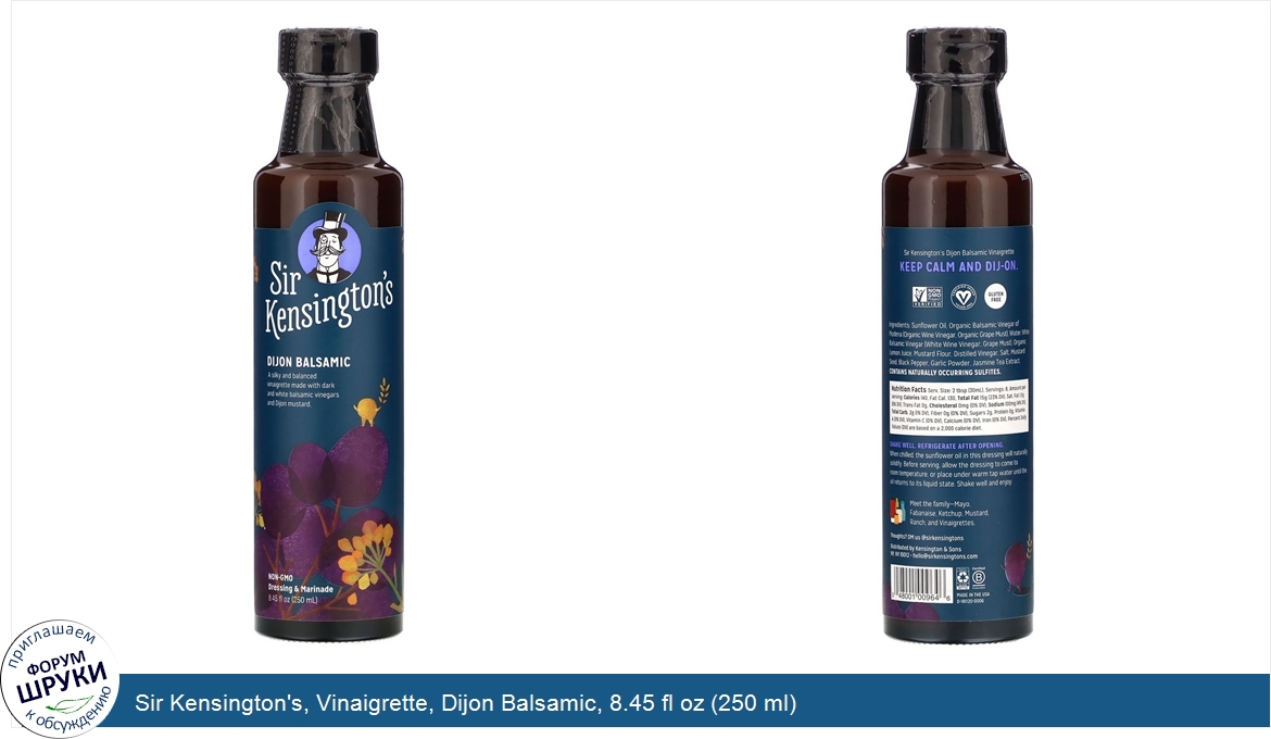 [DESCRIPT]Dressing Marinade. Non GMO Project Verified. Certified Vegan. Gluten Free. Certified B Corporation. A silk and balanced vinaigrette made with dark and white balsamic vinegars and dijon mustard. Sir Kensington's Dijon Balsamic vinaigrette keep calm and dij-on.[/DESCRIPT]... (описание дополняется)