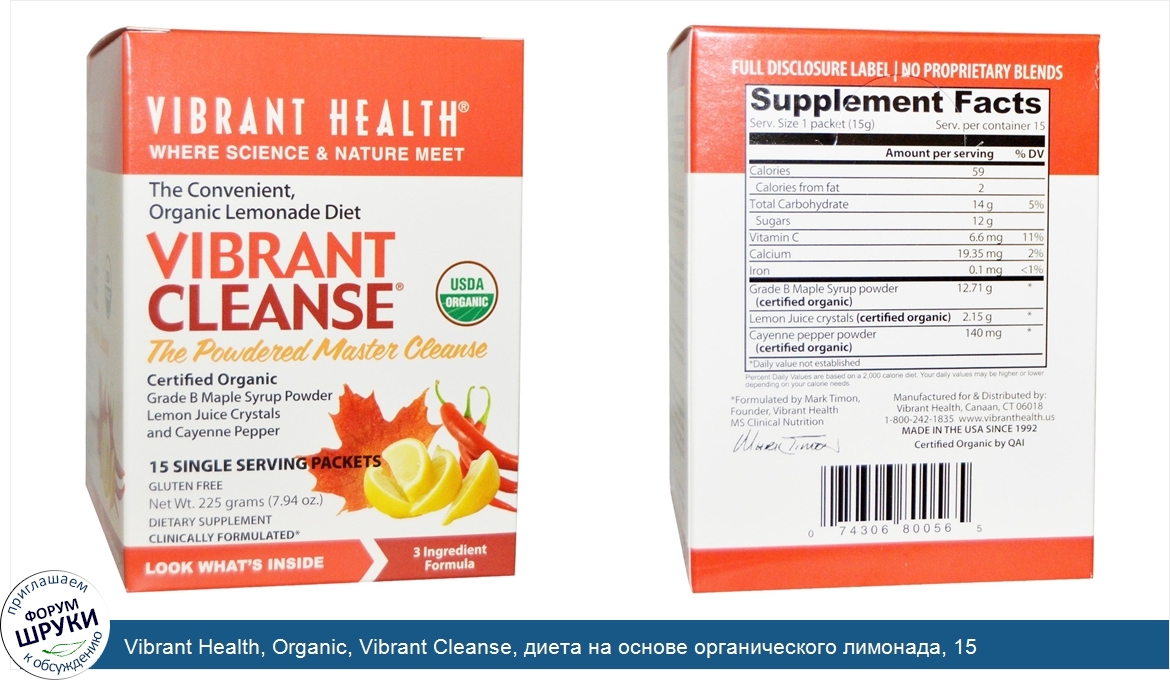 ru Vibrant Health, Organic, Vibrant Cleanse, диета на основе органического лимонада, 15 индивидуальных пакетиков, 7,94 унции (225 г)