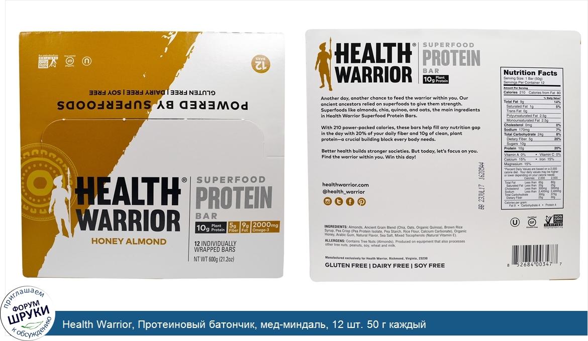 [DESCRIPT]10 g Plant Protein. 5 g Fiber. 9 g Fat. 2000 mg Omega-3. 12 Individually Wrapped Bars. Powered by Superfoods. Gluten Free. Dairy Free. Soy Free. Non GMO Project Certified. Another day, another chance to feed the warrior within you. Our ancient ancestors relied on superfoods to give them strength. Superfoods like almonds, chia, quinoa, and oats, the main ingredients in Health Warrior Superfood Protein Bars. With 210 power-packed calories, these bars help fill any nutrition gap in the day with 20% of your daily fiber and 10 g of clean, plant protein—a crucial building block every body needs. Better health builds stronger societies. But today, let's focus on you. Find the warrior within you. Win this day![/DESCRIPT]... (описание дополняется)