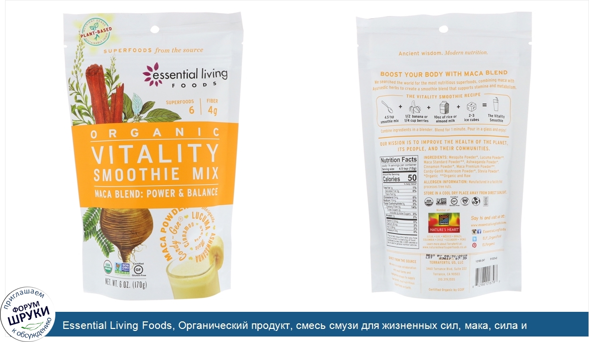 Essential Living Foods, Органический продукт, смесь смузи для жизненных сил, мака, сила и баланс, 6 унц. (170 г)