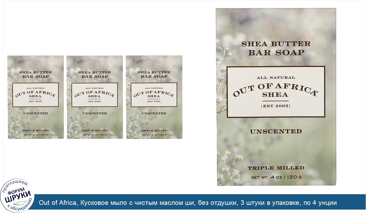 Друзья, если у вас есть отзыв/дополнение/комментарий/вопрос относительно Out of Africa, Кусковое мыло с чистым маслом ши, без отдушки, 3 штуки в упаковке, по 4 унции (120 г) каждое - напишите его ответом в эту тему (это будет полезно всему сообществу в целом и вам в отдельности).