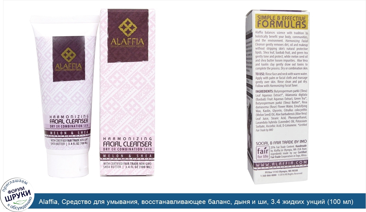 [DESCRIPT]Равенство – Возможности - Красота. Для сухой и комбинированной кожи. Сертифицированное масло ши, соответствующее надлежащим стандартам справедливой торговли, без ГМО. Справедливо для жизни. Продукция, соответствующая стандартам социальной и справедливой торговли, сертифицированная IMO. Fair For Life. Изготовлено вручную. Не содержит парабены. Веганский продукт. Не содержит глютен. Неочищенные ингредиенты. Без синтетических ароматизаторов. Биоразлагаемый. В местной упаковке. Простые и эффективные формулы. Alaffia объединяет науку и традиции, чтобы всецело приносить пользу вашему телу, обществу и окружающей среде. Приносящее гармонию средство для умывания мягко удаляет загрязнения, жир и макияж, не смывая естественный защитный липидный слой кожи. Листья дерева ши, плоды баобаба и зеленый чай мягко тонизируют и защищают кожу, в то время как масло из дынных семечек и масло ши удаляют загрязнения. Для завершения процесса, алоэ вера и каолиновая глина мягко выводят токсины. Для сухой или комбинированной кожи.[/DESCRIPT]... (описание дополняется)