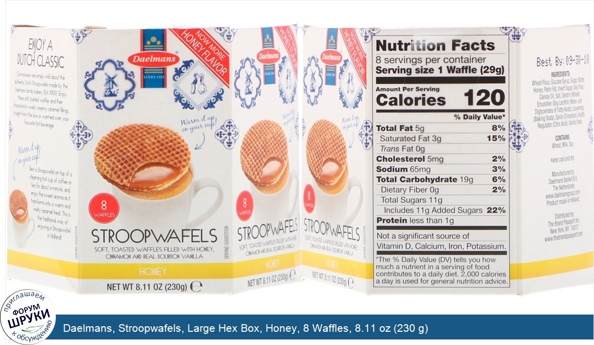 [DESCRIPT]Warm it Up on Your Cup. Now More Honey Flavor. Since 1909. Vegetarian. No Artificial Colors or Flavors. Certified Sustainable Palm Oil. Soft toasted waffles filled with honey, cinnamon and real bourbon vanilla. Enjoy a Dutch Classic. Connoisseurs are simply wild about the authentic Dutch Stroopwafels made by the Daelmans family bakery (est. 1909). Enjoy these soft, toasted waffles and their characteristic sweet, creamy caramel filings, straight from the box or warm over your favorite hot beverage. Rest a Stroopwafels on top of a steaming hot cup of coffee or tea for about a minute, and enjoy the sweet aroma as it transforms into a warm and melty caramel treat. This is a traditional way of enjoying a Stroopwafels in Holland![/DESCRIPT]... (описание дополняется)