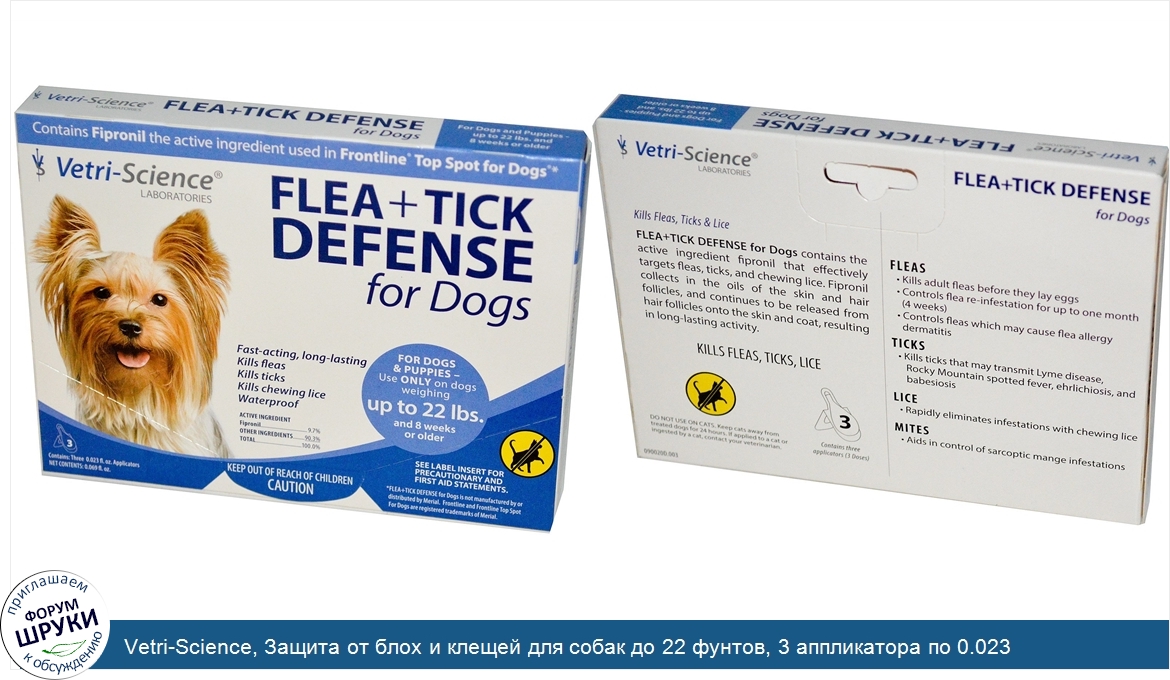 Друзья, если у вас есть отзыв/дополнение/комментарий/вопрос относительно Vetri-Science, Защита от блох и клещей для собак до 22 фунтов, 3 аппликатора по 0.023 жидких унций каждый - напишите его ответом в эту тему (это будет полезно всему сообществу в целом и вам в отдельности).