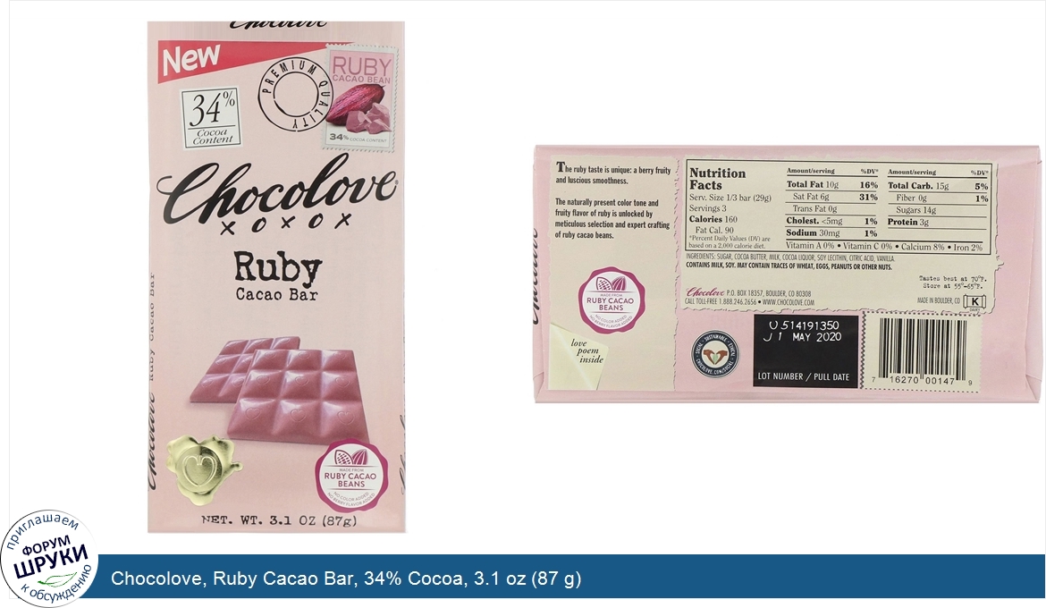 Друзья, если у вас есть отзыв/дополнение/комментарий/вопрос относительно Chocolove, Ruby Cacao Bar, 34% Cocoa, 3.1 oz (87 g) - напишите его ответом в эту тему (это будет полезно всему сообществу в целом и вам в отдельности).