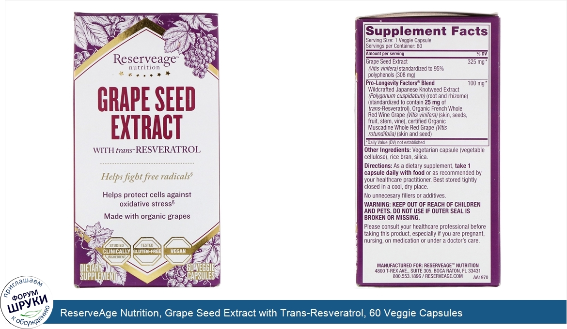 [DESCRIPT]Helps Fight Free Radicals. Helps Protect Cells Against Oxidative Stress. Made with Organic Grapes. Clinically Studied Ingredient. Tested Gluten-Free. Vegan. Dietary Supplement. Our Purpose. Inspired by the wisdom of nature and the healthiest cultures around the world, we travel the globe in search of the finest ingredients. Our goal is to provide, whenever possible, organic and natural ingredients in essential, science-based products that deliver life-changing benefits. Offering products that nourish your body, protect our planet and preserve traditional culture is core to our mission. Protect Your Health With 2 Strong Antioxidants. Reserveage Nutrition delivers a powerful formula to fight the effects of cellular aging and support your youthful essence. Grape Seed Extract is rich in polyphenol, a potent antioxidant that helps fight free radicals. To maintain optimal consistency and potency batch to batch, our grape seed extract is standardized to 95%. For enhanced antioxidant activity, Grape Seed Extract contains our proprietary resveratrol complex that combines polyphenol from organic grapes with trans-Resveratrol from a wildcrafted plant source. Clinical studies show trans-Resveratrol contains potent, beneficial compounds that are well absorbed. Made with Organic Wildcrafted Ingredients. Grape Seed Extract. Concentrated source of potent polyphenols and bioflavonoids. Pro-Longevity Factors Blend. Our proprietary Resveratrol complex made with Whole Grape Technology. trans-Resveratrol. The active and stable polyphenol from wildcrafted Japanese Knotweed, a plant containing a higher concentration of trans-Resveratrol than red wine. Organic French Red Wine Grapes. Grown and harvested in organic vineyards certified by Agriculture Biologique. Organic Muscadine Grapes. Sourced directly from certified organic farm.[/DESCRIPT]... (описание дополняется)