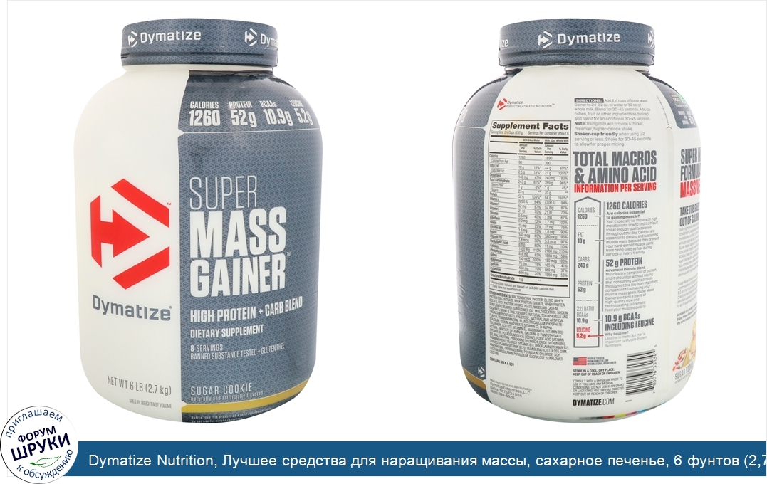 [DESCRIPT]1260 калорий. 52 г белка. 10,9 г аминокислот с разветвленной цепью. 5,2 г лейцина. Смесь с высоким содержанием протеина + углеводы. Пищевая добавка. 8 порций. Подтверждено отсутствие запрещенных веществ + не содержит глютена. Натуральные и искусственные ароматизаторы. Качественное питание для физической активности Dymatize Nutrition . Употребляйте Dymatize. Общее количество макроэлементов и аминокислот на порцию. 1260 калорий. Важны ли калории для набора мышечной массы? Да! Калории особенно полезны для людей с быстрым обменом веществ или для тех, кто испытывает проблемы с потреблением достаточного количества калорий в течение дня. Калории необходимы для набора и поддержания мышечной массы, так как они предотвращают использование наработанной с таким трудом мышечной массы в качестве топлива для организма во время тяжелой тренировки. 19 г жиров. 243 г углеводов. Передовая протеиновая смесь с 52 г белка. Мышцы состоят из белка, и, вне всяких сомнений, употребление высококачественного белка в течение дня крайне важно для достижения целей по набору мышечной массы. Super Mass Gainer содержит сочетание качественных белков медленного и быстрого усвоения для быстрого питания ваших мышц. 10,9 г аминокислот с разветвленной цепью в пропорции 2:1:1. 10,9 г BCAA, включая лейцин. Лейцин 5,2 г - Почему именно лейцин? Лейцин — это аминокислота с разветвленной боковой цепью (BCAA), которая играет важную роль в синтезе протеина для мышечной ткани. Informed-Choice. ORG доверие спорта. Informed-Choice — программа гарантии качества, в рамках которой сертифицируют пищевые добавки и/или ингредиенты. Продукты с логотипом Informed-Choice проверены на отсутствие запрещенных веществ передовой спортивной антидопинговой лабораторией LGC. Содержание на порцию. 62 г белка. 1260 калорий. 243 г углеводов. Жиры 10 г. Сахар 23 г. Аминокислоты с разветвленной цепью - 10,9 г. 5,2 г лейцина. Super Mass Gainer разработан лишь с одной целью: значительное увеличение мышечной массы. Перестаньте наугад определять количество потребляемых калорий. Набор мышечной массы и увеличение объема могут быть очень тяжелой задачей, особенно для людей с быстрым обменом веществ или тех, кто испытывает трудности с потреблением достаточного количества калорий и протеина в течение дня. Super Mass Gainer — это высококачественная формула для набора массы и увеличения объема, которая содержит большое количество протеинов, BCAA, калорий и прочих питательных веществ, которые в состоянии помочь набрать массу почти любому. В отличие от множества других средств для набора массы, Super Mass Gainer имеет прекрасный вкус и отлично смешивается! Super Mass Gainer содержит 10,9 грамм аминокислот с разветвленной цепью и 5,2 грамма лейцина, а также 1 г моногидрата креатина. Super Mass Gainer, помимо прочего, может служить источником витаминов и минералов для сбалансированного рациона питания. Исследования и разработка. Протеиновые формулы Dymatize основаны на передовых научных разработках и тестируются в университетах и в элитных профессиональных тренировочных залах. Протеиновые порошки Dymatize производятся исключительно на объектах, сертифицированных по GMP и Sport Certified, что означает, что все ингредиенты и итоговый продукт тщательно тестируются и проверяются на чистоту и безопасность. Они протестированы на отсутствие запрещенных веществ компанией Informed-Choice (www.informed-choice.org). Известный по всему миру за качество, вкус и чи