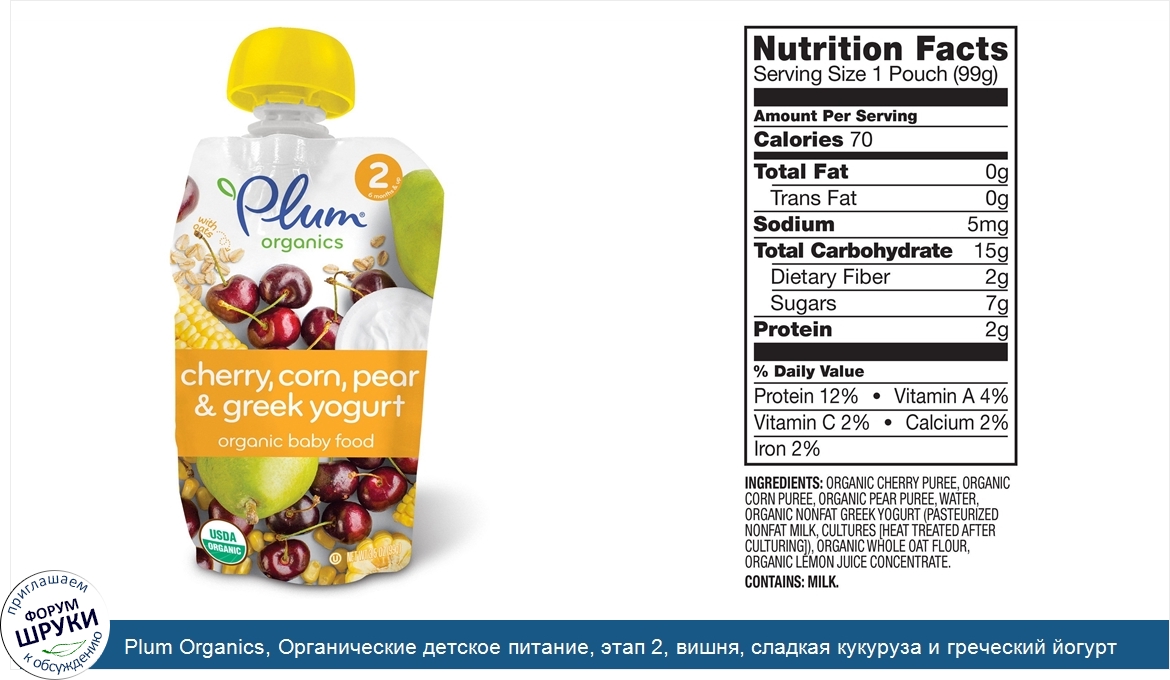Друзья, если у вас есть отзыв/дополнение/комментарий/вопрос относительно Plum Organics, Органические детское питание, этап 2, вишня, сладкая кукуруза и греческий йогурт, 3,5 унции (99 г) - напишите его ответом в эту тему (это будет полезно всему сообществу в целом и вам в отдельности).