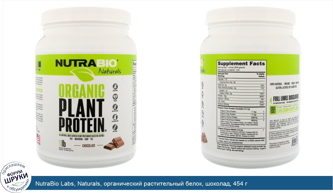 [DESCRIPT]Non-GMO. Vegan. Gluten Free. Lactose Free. Soy Free. All-Natural, Multi-Sourced Plant Protein with Digestive Enzymes. Rice - Mushroom - Hemp - Pea. Dietary Supplement. 100% Natural. Organic. Gluten, Lactose, Soy Dairy Free. Full Label Disclosure - No Proprietary Blends - Every Ingredient Disclosed with Dosage. Since 1996. Protein, Like Mother Nature Intended. NutraBio's Organic Plant Protein combines four raw plant protein sources, fusing the natural benefits of pea, rice, hemp and mushroom proteins. We handpick our ingredients from organic family farms and manufacture in our own cGMP facility to bring you the cleanest, highest-quality plant protein. This is simply the best-tasting organic plant protein there is. It has specialized enzyme blend to improve digestion and includes all essential amino acids. We gently produce our protein using low-temperature, low-shear technology, which prevents denaturing and preserves the integrity of the protein, just like Mother Nature intended.[/DESCRIPT]... (описание дополняется)