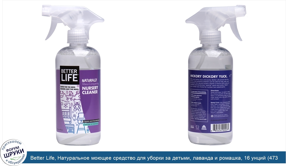 Друзья, если у вас есть отзыв/дополнение/комментарий/вопрос относительно Better Life, Натуральное моющее средство для уборки за детьми, лаванда и ромашка, 16 унций (473 мл) - напишите его ответом в эту тему (это будет полезно всему сообществу в целом и вам в отдельности).