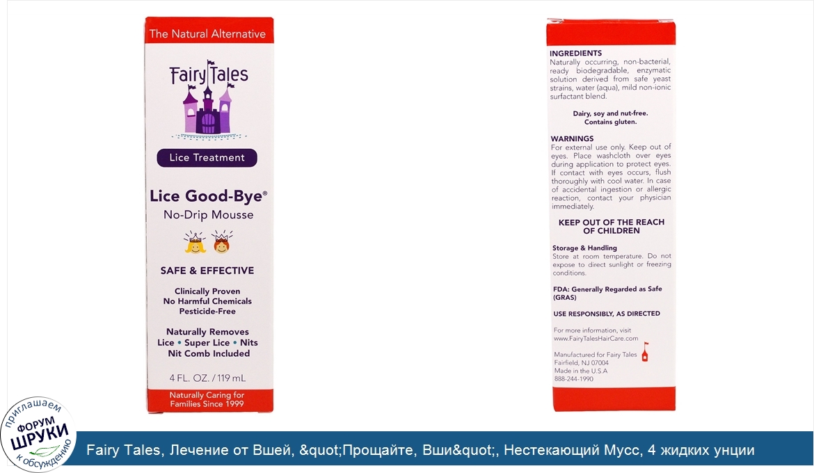[DESCRIPT]The Natural Alternative. Safe Effective. Clinically Proven. No Harmful Chemicals. Pesticide-Free. Naturally Caring for Families Since 1999. Dairy, Soy and Nut-Free. Contains Gluten. Naturally Removes:. Lice. Super Lice. Nits. Nit Comb Included. Natural Alternative. Fairy Tales Lice Good-Bye. No-Drip Mousse is clinically proven to dissolve "nit glue" and helps eliminate lice, using a combination of naturally occurring enzymes. Use with nit comb to help remove lice and their eggs (nits) without harsh chemicals and pesticides. Facts of Lice. What are lice? Head lice are grayish/brown and about the size of a sesame seed. They are found directly on the scalp and move quickly. What is a Nit? Nits are lice eggs, tiny grayish sacs the size of a pinpoint. They are attached to the hair strand with a sticky nit glue. Nits are found 1/4-1/2 inch from the scalp, and most commonly at the hot spots behind the ears, at the nape of the neck and at part lines. Once hatched, they migrate to the scalp to feed and lay their own eggs within 7-10 days. How are Head Lice Spread? Lice are most commonly spread through head-to-head contact. They infest children more than adults because they have more physical contact at that age. Lice can survive up to 24-36 hours off the human head on hats, pillows, towel and other personal items.[/DESCRIPT]... (описание дополняется)