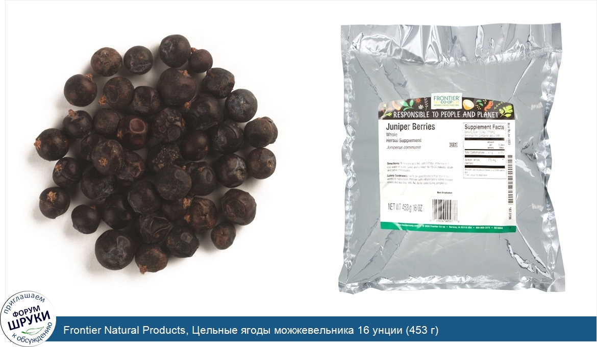 Друзья, если у вас есть отзыв/дополнение/комментарий/вопрос относительно Frontier Natural Products, Цельные ягоды можжевельника 16 унции (453 г) - напишите его ответом в эту тему (это будет полезно всему сообществу в целом и вам в отдельности).