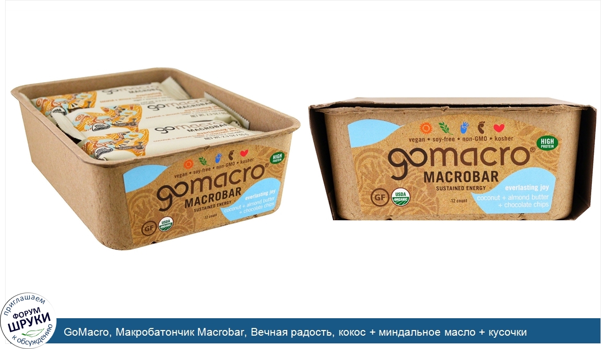 GoMacro, Макробатончик Macrobar, Вечная радость, кокос + миндальное масло + кусочки шоколада, 12 батончиков по 65 г (2.3 oz)